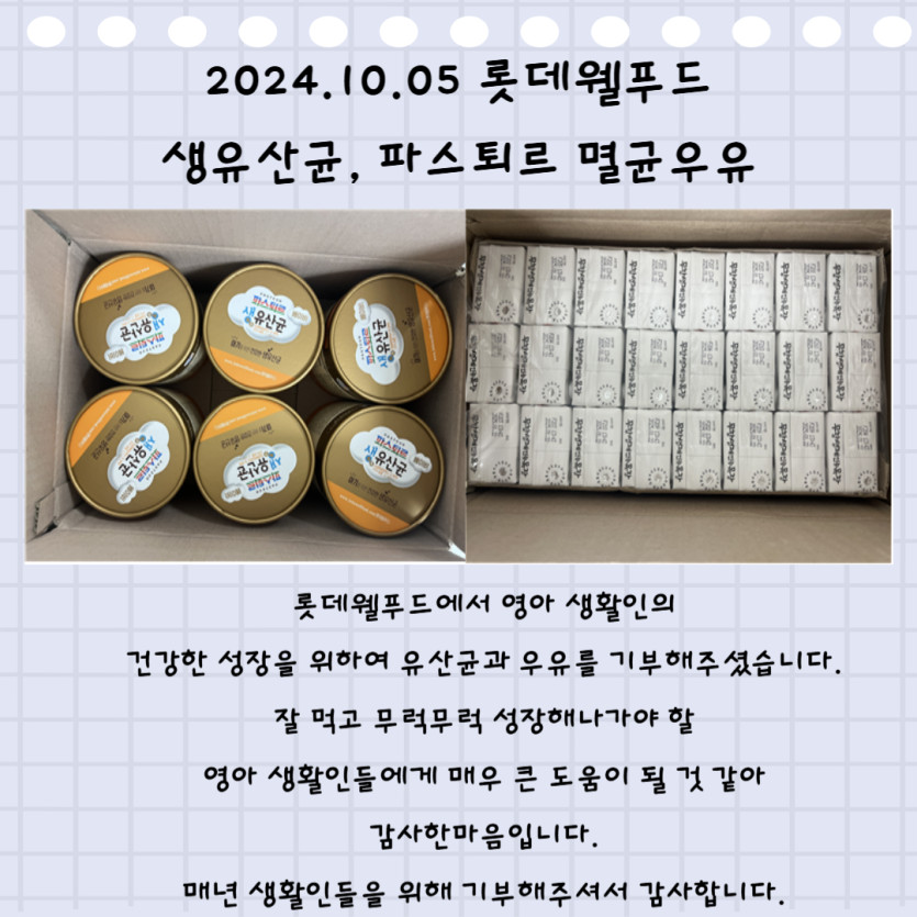 2024. 10. 05. 롯데웰푸드 생유산균, 파스퇴르 멸균우유 기부 페이지 정보 작성자 도담하우스 댓글 0건 조회 120회 작성일 2024-10-14 15:07 본문 2024. 10. 05. 롯데웰푸드 생유산균, 파스퇴르 멸균우유 기부 SNS공유 검색 목록 이전글2024. 10. 06. 스위트리 박요섭님 과일 후원 24.10.14 다음글2024. 10. 02. 대명복지재단 매트리스 5개 기부 24.10.14 댓글목록 댓글목록 등록된 댓글이 없습니다.
