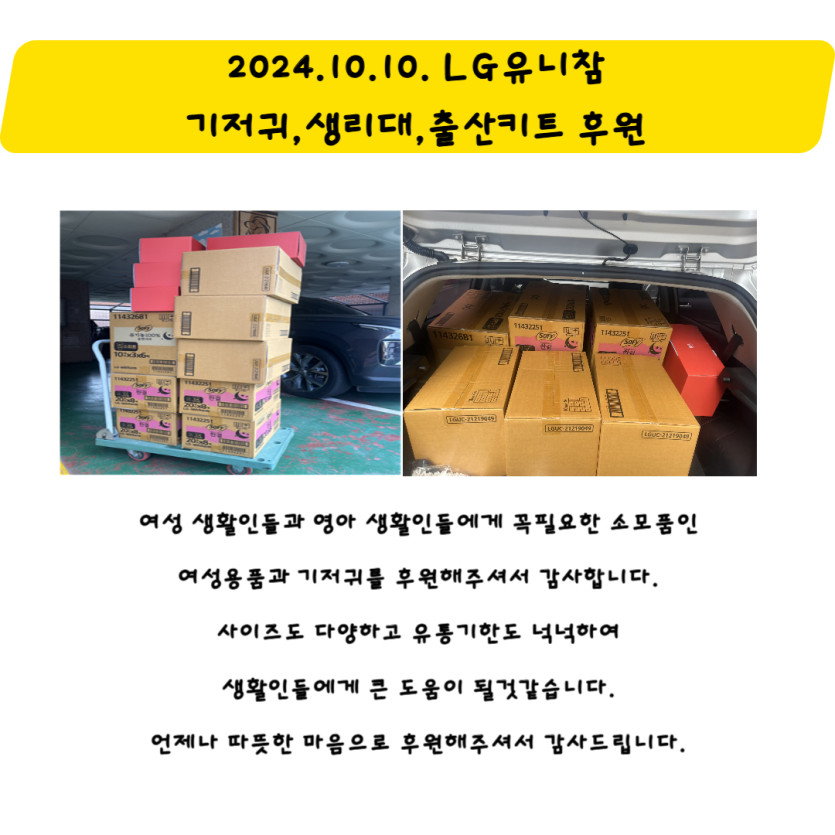 2024.10 .10. LG유니참 기저귀,여성용품,출산키트 기부 페이지 정보 작성자 도담하우스 댓글 0건 조회 217회 작성일 2024-10-14 15:09 본문 2024.10 .10. LG유니참 기저귀,여성용품,출산키트 기부 SNS공유 검색 목록 이전글2024. 10. 25. 한솔섬유 육아용품 후원 24.11.01 다음글2024. 10. 06. 스위트리 박요섭님 과일 후원 24.10.14 댓글목록 댓글목록 등록된 댓글이 없습니다.