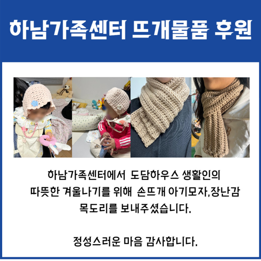 하남가족센터 뜨개물품 후원 페이지 정보 작성자 도담하우스 댓글 0건 조회 98회 작성일 2024-11-27 14:20 본문 하남가족센터 뜨개물품 후원 SNS공유 검색 목록 이전글2024. 11. 21. 후원자 송주현 기저귀 후원 24.11.27 다음글2024. 11. 20. 케이엠텍 아기로션&세럼 12box 후원 24.11.27 댓글목록 댓글목록 등록된 댓글이 없습니다.