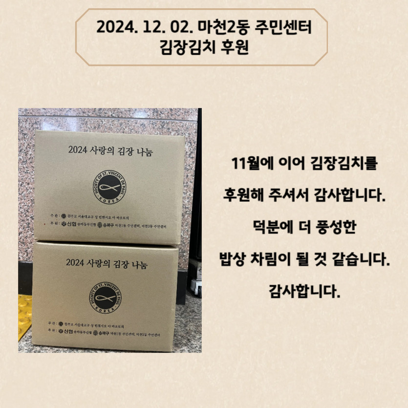 2024. 12. 02. 마천2동 주민센터 김장김치 후원 페이지 정보 작성자 도담하우스 댓글 0건 조회 202회 작성일 2024-12-09 18:36 본문 2024. 12. 02. 마천2동 주민센터 김장김치 후원 SNS공유 검색 목록 이전글2024. 12. 05. 롯데웰푸드 파스퇴르 멸균우유 후원 24.12.10 다음글2024. 11. 29. 주식회사 영풍농산물 망고 후원 24.12.09 댓글목록 댓글목록 등록된 댓글이 없습니다.
