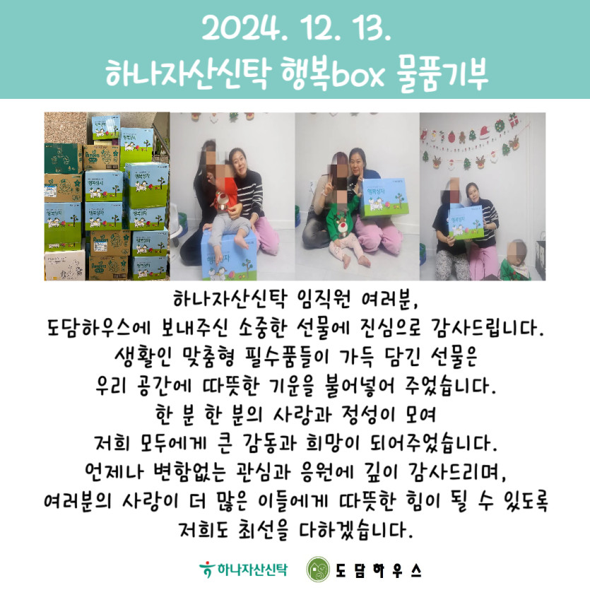 2024. 12. 13. 하나자산신탁 행복BOX 물품기부 페이지 정보 작성자 도담하우스 댓글 0건 조회 101회 작성일 2025-01-21 17:15 본문 2024. 12. 13. 하나자산신탁 행복BOX 물품기부 SNS공유 검색 목록 이전글2024. 12. 16. 환경실천연합회 유아 장난감 기부 25.01.21 다음글2024. 12. 13. 엘빈즈 간식 꾸러미 기부 25.01.02 댓글목록 댓글목록 등록된 댓글이 없습니다.