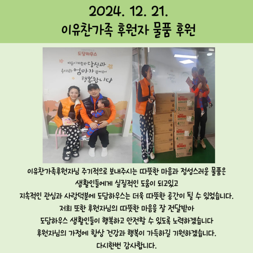 2024. 12. 21. 이유찬가족 후원자 물품후원 페이지 정보 작성자 도담하우스 댓글 0건 조회 100회 작성일 2025-01-21 17:19 본문 2024. 12. 21. 이유찬가족 후원자 물품후원 SNS공유 검색 목록 이전글2024. 12. 23. 따뜻한 나눔, 소중한초대에 감사드립니다. 25.01.21 다음글2024. 12. 18. 한국산업은행 후원금 전달 25.01.21 댓글목록 댓글목록 등록된 댓글이 없습니다.