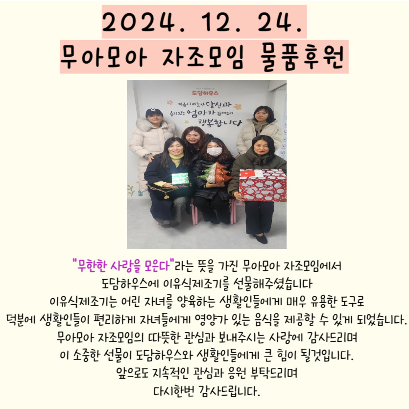 2024. 12. 24. 무아모아 자조모임 물품후원 페이지 정보 작성자 도담하우스 댓글 0건 조회 200회 작성일 2025-01-21 17:20 본문 2024. 12. 24. 무아모아 자조모임 물품후원 SNS공유 검색 목록 이전글2024. 12. 24. 엔젤앤비 물품후원 25.02.05 다음글2024. 12. 23. 따뜻한 나눔, 소중한초대에 감사드립니다. 25.01.21 댓글목록 댓글목록 등록된 댓글이 없습니다.