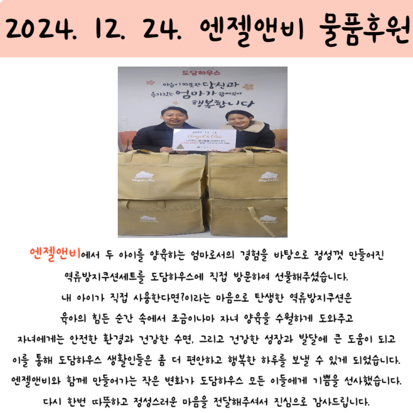 2024. 12. 24. 엔젤앤비 물품후원 페이지 정보 작성자 도담하우스 댓글 0건 조회 97회 작성일 2025-02-05 17:34 본문 2024. 12. 24. 엔젤앤비 물품후원 SNS공유 검색 목록 이전글2024. 12. 25. 익명 개인후원물품 25.02.05 다음글2024. 12. 24. 무아모아 자조모임 물품후원 25.01.21 댓글목록 댓글목록 등록된 댓글이 없습니다.