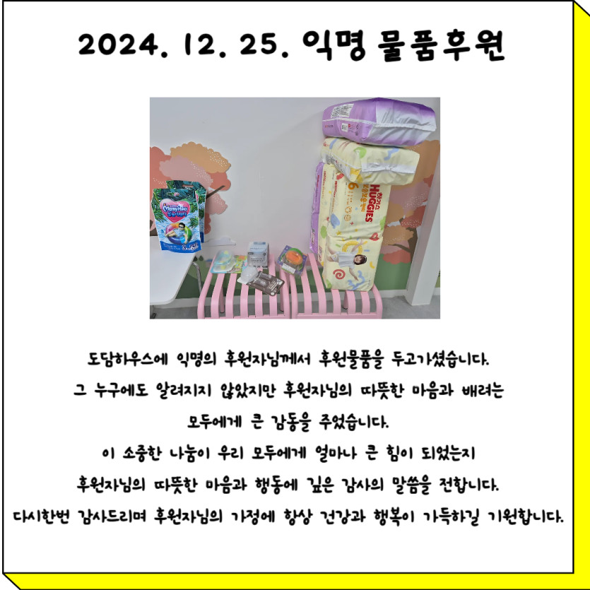 2024. 12. 25. 익명 개인후원물품 페이지 정보 작성자 도담하우스 댓글 0건 조회 96회 작성일 2025-02-05 17:34 본문 2024. 12. 25. 익명 개인후원물품 SNS공유 검색 목록 이전글2024. 12. 26. 광진구 구의교회 행복박스 후원 25.02.05 다음글2024. 12. 24. 엔젤앤비 물품후원 25.02.05 댓글목록 댓글목록 등록된 댓글이 없습니다.
