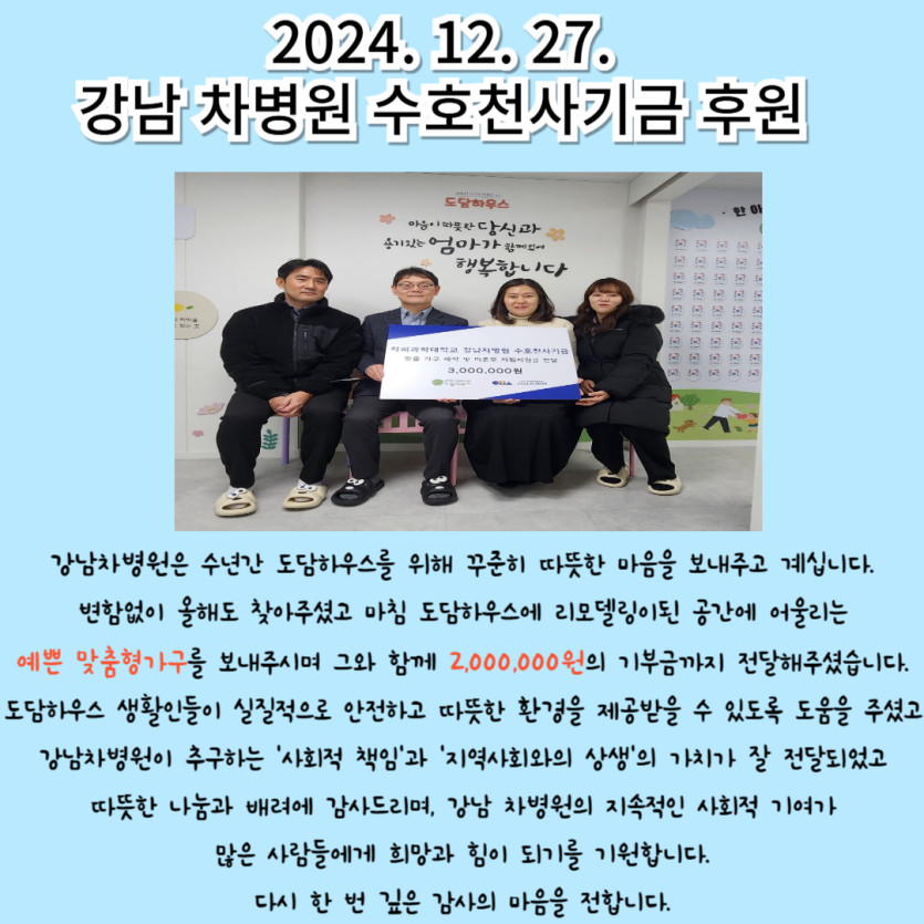 2024. 12. 27. 강남차병원 수호천사기금 후원 페이지 정보 작성자 도담하우스 댓글 0건 조회 108회 작성일 2025-02-05 17:36 본문 2024. 12. 27. 강남차병원 수호천사기금 후원 SNS공유 검색 목록 이전글2024. 12. 28. 다이나 아기 턱받이 후원 25.02.05 다음글2024. 12. 26. 광진구 구의교회 행복박스 후원 25.02.05 댓글목록 댓글목록 등록된 댓글이 없습니다.