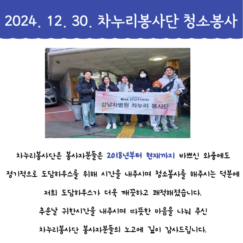 2024. 12. 28. 차누리봉사단 청소봉사 페이지 정보 작성자 도담하우스 댓글 0건 조회 190회 작성일 2025-02-05 17:53 본문 2024. 12. 28. 차누리봉사단 청소봉사 SNS공유 검색 목록 이전글2024. 12. 31. 뉴앤트세일러즈 생활물품 후원 25.02.05 다음글2024. 12. 28. 다이나 아기 턱받이 후원 25.02.05 댓글목록 댓글목록 등록된 댓글이 없습니다.