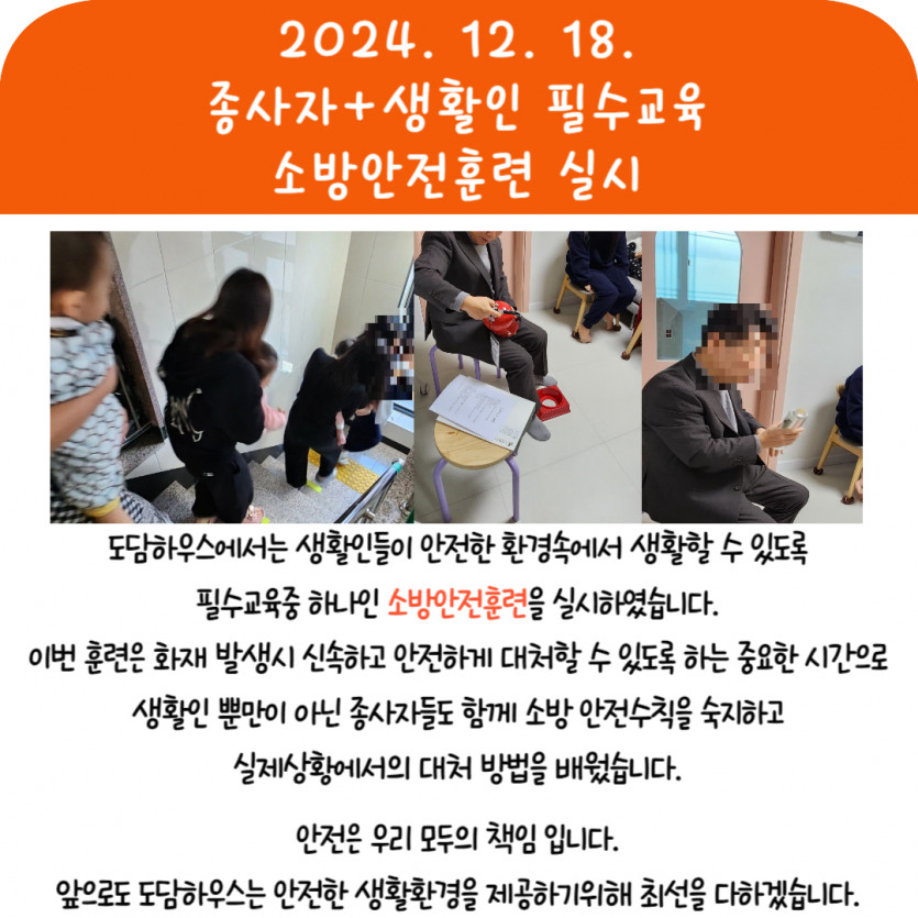 2024. 12. 18. 필수교육 소방안전훈련 실시 페이지 정보 작성자 도담하우스 댓글 0건 조회 106회 작성일 2025-01-21 17:18 본문 2024. 12. 18. 필수교육 소방안전훈련 실시 SNS공유 검색 목록 이전글2024. 12. 20. 필수교육 폭력과 학대예방 교육 실시 25.01.21 다음글2024. 12. 20. 생활인 필수교육 '폭력과 학대예방'진행 25.01.09 댓글목록 댓글목록 등록된 댓글이 없습니다.