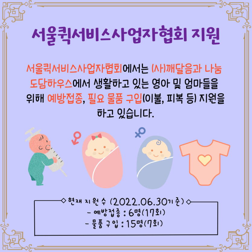 서울퀵서비스사업자협회 지원 ♥ 페이지 정보 작성자 도담하우스 댓글 0건 조회 729회 작성일 2022-06-30 08:11 본문 2022년 서울퀵서비스사업자협회에서입소 영아 및 미혼모 생활인들에게필수 예방접종과 필요 물품 등을 지원하여안전하고 쾌적한 환경에서 지낼 수 있도록 해주셨습니다.감사드립니다. SNS공유 목록 이전글고구마 후원♥ 22.10.25 다음글힐링캠프 ♥ 22.09.19 댓글목록 댓글목록 등록된 댓글이 없습니다.
