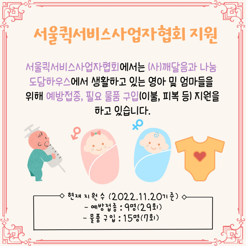 서울퀵서비스사업자협회 지원사업♥ 페이지 정보 작성자 도담하우스 댓글 0건 조회 847회 작성일 2022-11-21 09:27 본문 2022년 서울퀵서비스사업자협회에서입소 영아 및 미혼모 생활인들에게필수 예방접종과 필요 물품 등을 지원하여안전하고 쾌적한 환경에서 지낼 수 있도록 해주셨습니다.감사드립니다. SNS공유 목록 이전글우양재단 지원♡ 22.12.22 다음글고구마 후원♥ 22.10.25 댓글목록 댓글목록 등록된 댓글이 없습니다.