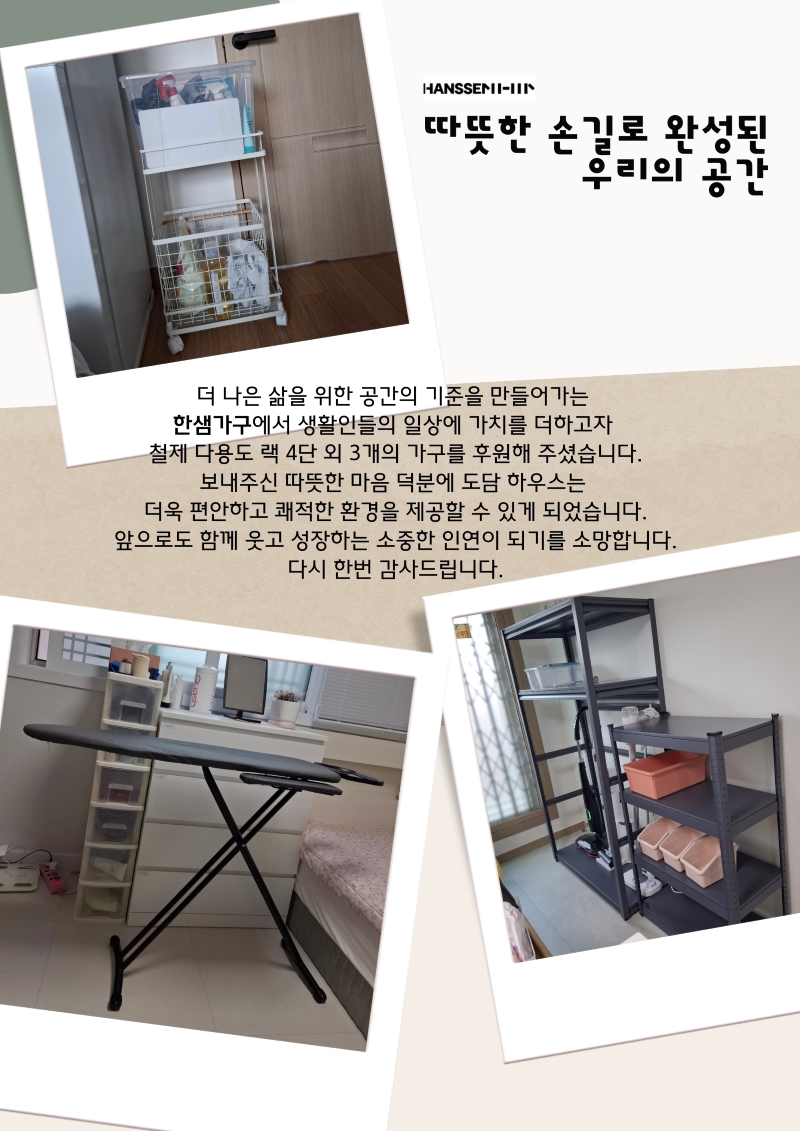 서한협과 한샘이 함께하는 가구 후원 페이지 정보 작성자 도담하우스 댓글 0건 조회 9회 작성일 2026-03-23 17:00 본문 서한협과 '한샘'이 함께하는 가구 후원 SNS공유 목록 다음글"대한불교조계종 송광사 서울분원 법련사에서 도담하우스를 응원합니다" 26.03.13 댓글목록 댓글목록 등록된 댓글이 없습니다.